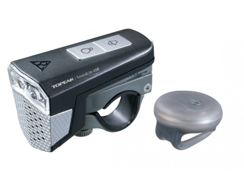 Передняя фара Topeak SoundLite USB с встроенным звуковым сигналом. В комплекте беспроводная кнопка для управления гудком. Мощная передняя фара состоит из 3 супер-ярких LED светодиодов мощностью 0.2W каждый. Электронный гудок развивает громкость 75-97 dB