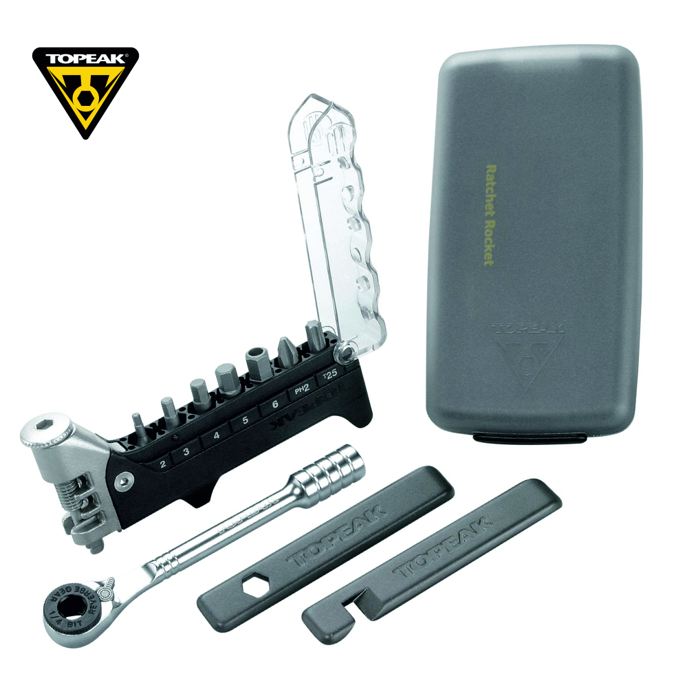Удобный миниатюрный набор инструментов Topeak Ratchet Rocket с быстрым ключом-трещоткой. Ключ-трещотка Rocket представляет собой тонкий зубчатый храповой механизм ключа-трещотки с колесом с застежкой на большой лопатке для быстрого вращения и контроля в тесных местах и включает в себя насадки